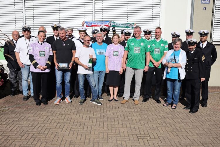 Da die Besatzung des Minenjagdbootes dem Fußballverein FC 08 Homburg sehr verbunden ist, durfte ein Besuch in der Geschäftsstelle nicht fehlen. Der 1. Vorsitzende Hans Gassert und Geschäftsführer Rafael Kowollik überreichten von Puttkamer und Just sowie Börm und Holzhüter personalisierte Trikots.