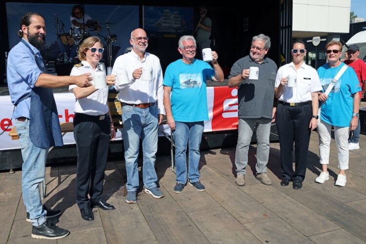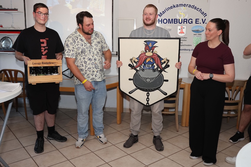 Abends begrüßte Manfred Abel, erster Vorsitzender der MK Homburg, Besatzung und Ehrengäste im Vereinsheim in Homburg-Beeden zum Grillabend. Nach einer Diashow über die 30-jährige Patenschaft überreichte die Besatzung Manfred Abel das große Wappenschild mit „Sam“, das die Homburg jahrelang an der „Eiger-Nordwand“ unterhalb der Brücke gefahren hat. Für ihre zehnjährige Mitgliedschaft erhielten Christine Becker, Volker Kern, Otwin Neumann und Peter Becker von Heinz Maurus ihre Ehrenurkunde und von Cornelia Just ihre Ehrennadel. Manfred Rippel bekam als Neumitglied den DMB-Seesack.