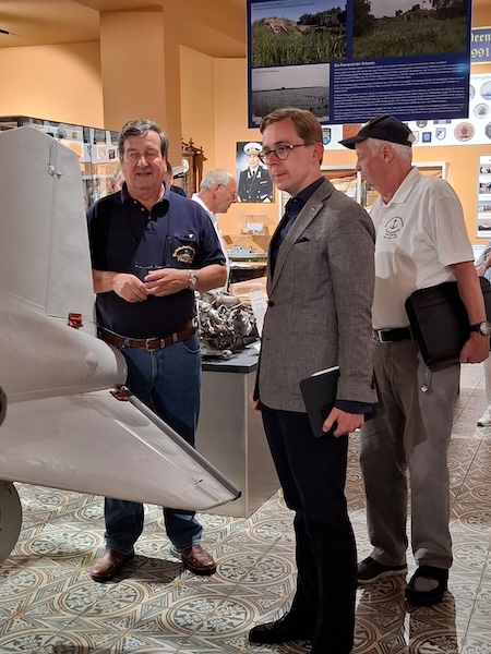 Vor kurzem wurde dann über sein Wahlkreisbüro ein Termin zum Besuch vereinbart. Am 18. August 2025 war es dann soweit und der nunmehrige parlamentarische Staatssekretär im Deutschen Bundestag, Philipp Amthor, besuchte tatsächlich die Marinekameradschaft Peenemünde. Nach einem Abstecher ins Historisch Technische Museum Peenemünde kam er mit seiner Assistentin Anne Heilmann ins Marine- und Fliegermuseum Peenemünde. Nach einer kurzen Begrüßung ging es dann zum Rundgang zunächst ins „Marinemuseum der 1. Flottille der Volksmarine“. Zuvor wurde ihm aber erst der in Berlin vergessene Wimpel der MK Peenemünde übergeben! Er ließ sich von den anwesenden Kameraden über die Volksmarine und insbesondere über die 1. Flottille informieren. Weiter ging es ins „Museum des Jagdfliegergeschwaders 9“, wo Lutz Hübner (Archivar beider Museen) sein „Herzensprojekt“ präsentieren konnte.