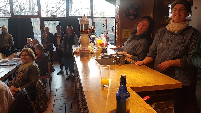 Wir konnten etwa 50 Musikfans begrüßen, die zunächst beim Einsingen und Warmmachen eifrig mitmachten und dann – von Waltraud und Sigrid animiert – mit Inbrunst die Shantys, Seemannslieder und auch maritimen Schlager mitsangen und mitklatschten. Unterstützt wurden die Gäste dabei von Jan, der den Laptop bediente und die Liedertexte per Beamer an die Wand warf. Unsere Sängerinnen und Sänger mischten sich unters Publikum oder schunkelten hinter der Theke, was unsere Akkordeonspieler aus Platzgründen leider nicht konnten.
