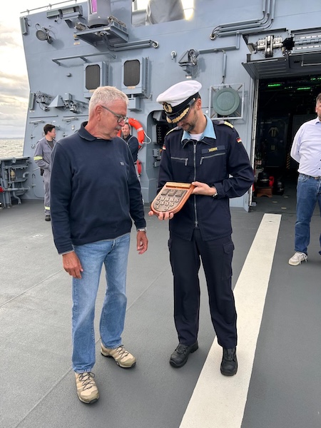 Auf dem Flugdeck wurde die Kommandantenmusterung vorbereitet, der Tagesbefehl für den kommenden Tag ausgegeben und von mir mit einer kleinen Dankesrede ein originaler Abguss des Schiffswappens des Kutters kleiner Kreuzer „Cöln“ der Marinekameradschaft Leuchtturm übergeben.