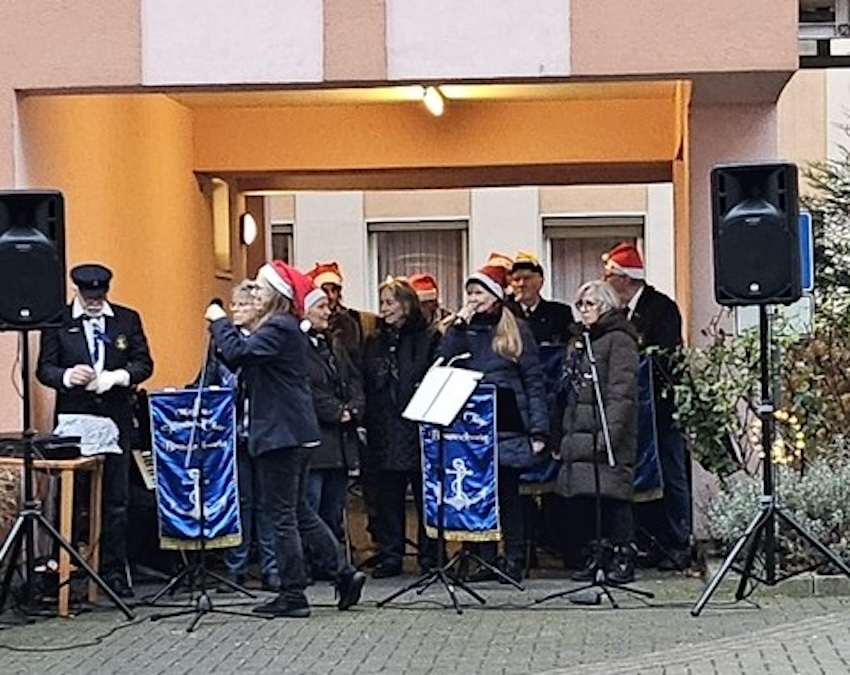 Zur Adventszeit, ist der Chor der Marinevereinigung Braunschweig im Alloheim „Senioren-Residenz Brunswick“ aufgetreten. Hier war ein Weihnachtsmarkt aufgebaut, Bänke und Tische standen bereit, alles war schön geschmückt. Trotz des nasskalten Wetters hatten sich einige Bewohner eingefunden und der Chor sang für sie von Wind, Wasser und dem Meer, aber auch traditionelle Weihnachtslieder. Insbesondere eine Bewohnerin im Rollstuhl sang begeistert, begleitet von ihren Kindern, zahlreiche Lieder mit.